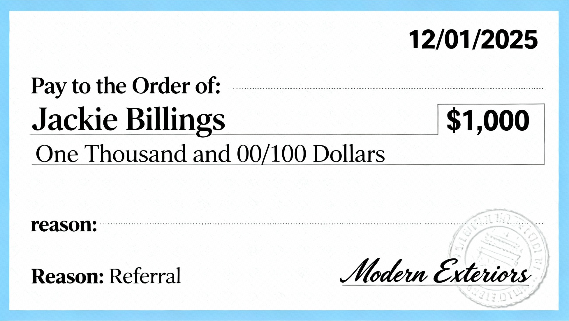 Your referral will get $1,000 off their roof and you will get $1,000 check upon install!